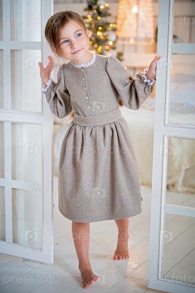 Девочка в светлом интерьере радостно выглядывает из двери, смеется. Сквозь стекло видна елка