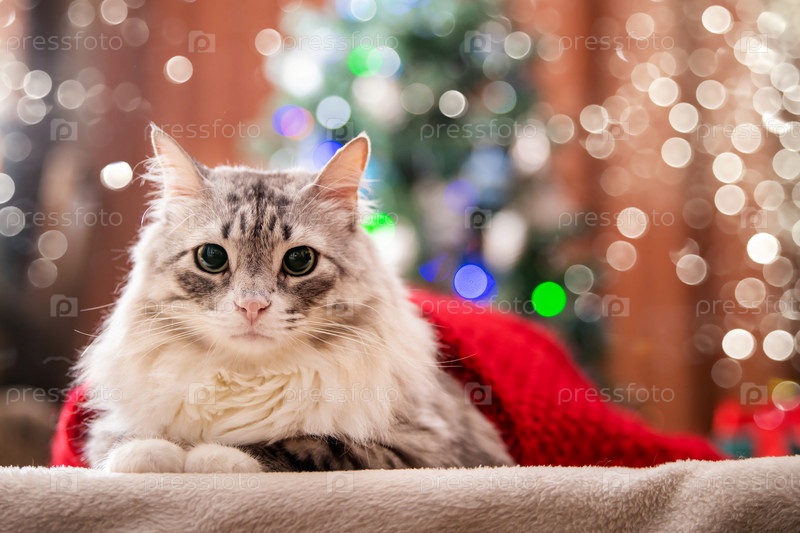 Рождественский кот. Портрет толстого пушистого кота рядом с подарочной коробкой на фоне елки и огней гирлянд