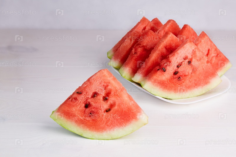 Свежий спелый нарезанный арбуз на белом деревянном фоне