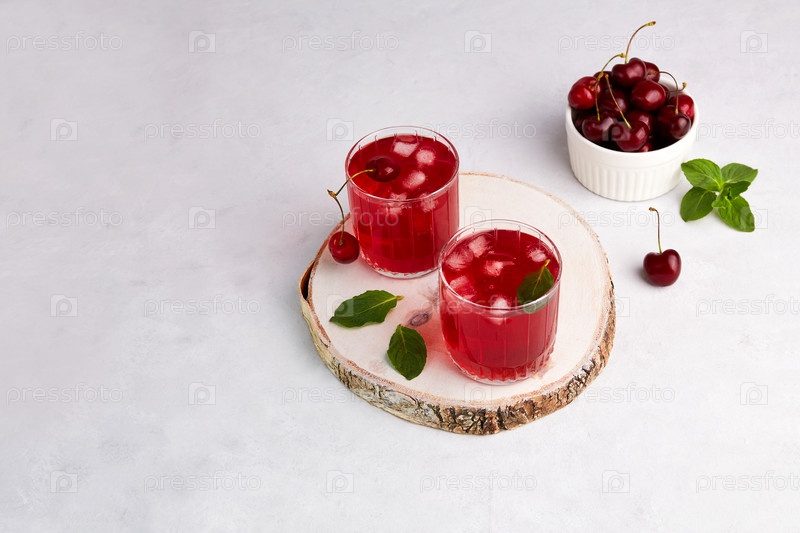 Два стакана вишневого коктейля на белой деревянной доске. Свежий холодный освежающий летний напиток с вишней и льдом