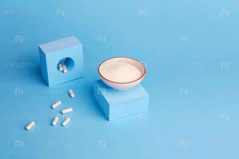 Коллагеновый протеиновый порошок и капсулы на синем фоне. Пищевая добавка для кожи и суставов