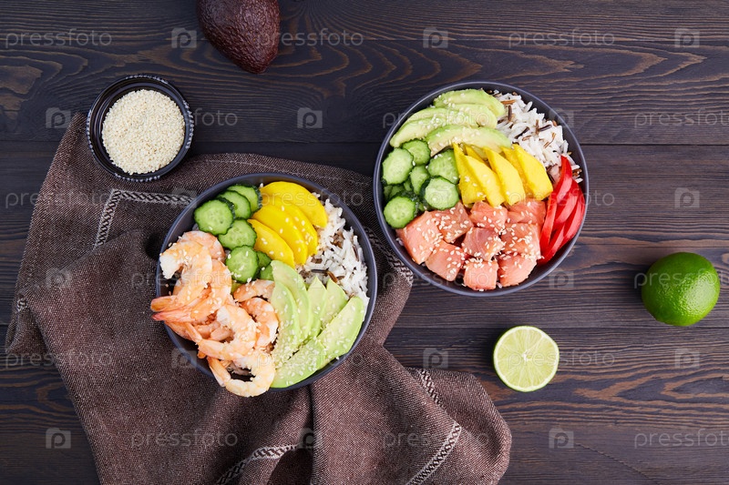 Поке боул с лососем, креветками, рисом, авокадо, огурцом, манго, перцем и кунжутом, соевым соусом