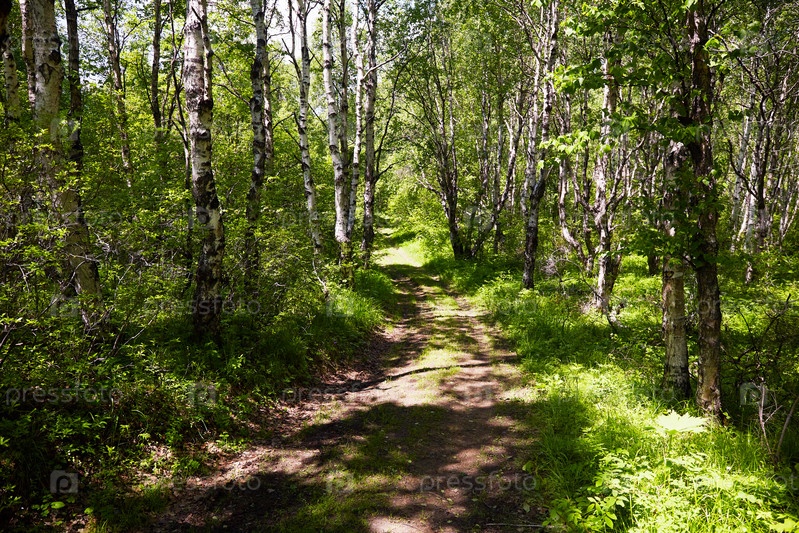 Проселочная дорога в густом лесу в солнечный летний день