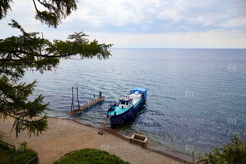 Озеро Байкал в пасмурный летний день. Корабль на берегу озера, романтическая пара обнимается на пирсе