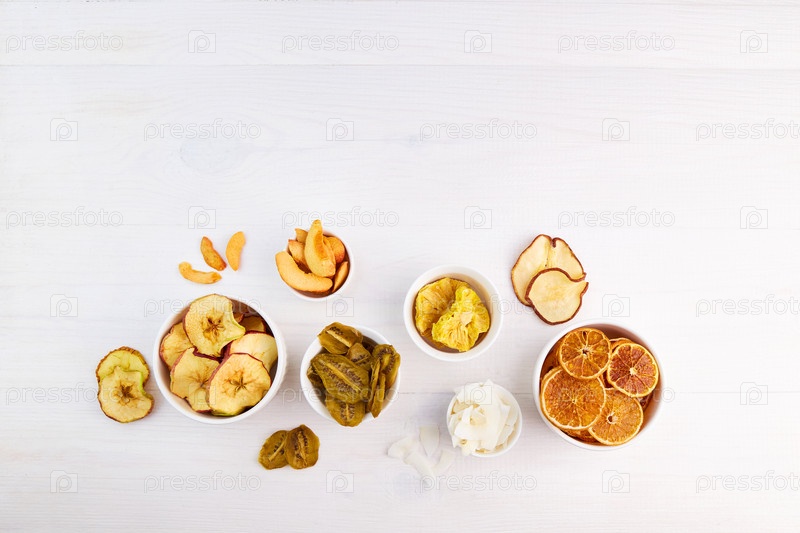 Сушеные яблоки, груши, ананасы, киви, абрикосы, кокосовые, апельсиновые и мандариновые чипсы в мисках на сером фоне