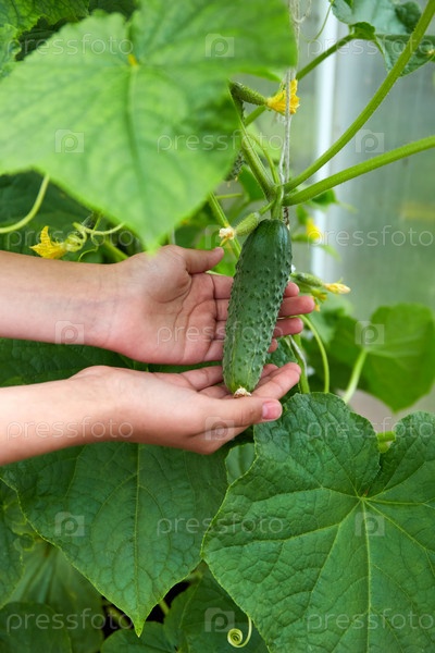 Сбор огурцов в руках. Выращивание органических овощей в домашней теплице