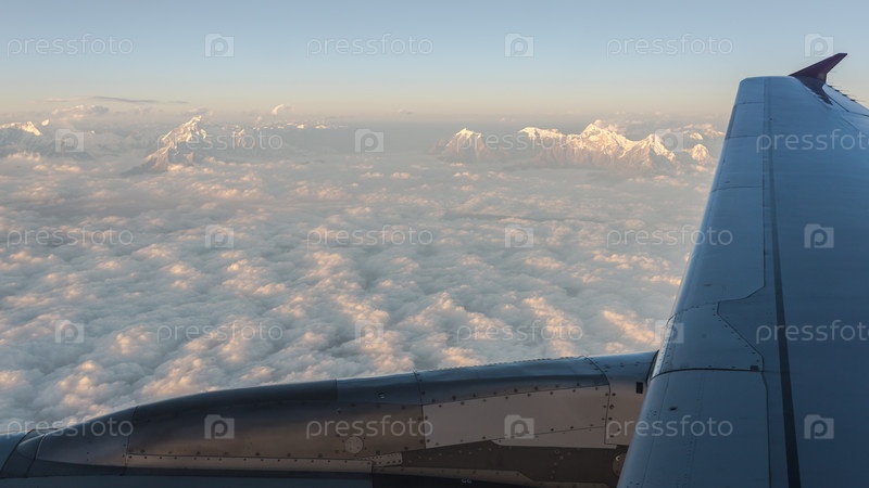 Вид с воздуха на горы Гималаи на закате из иллюминатора самолета