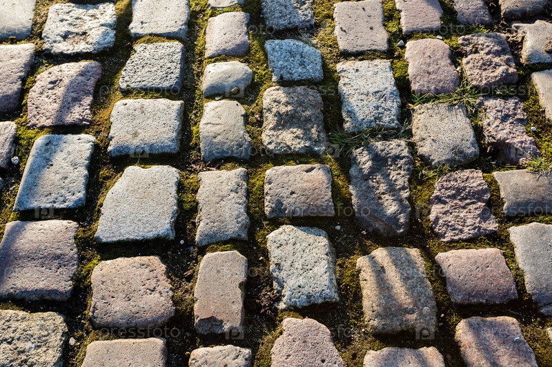 Старая каменная мостовая с зеленым мхом. Текстура грубого фона