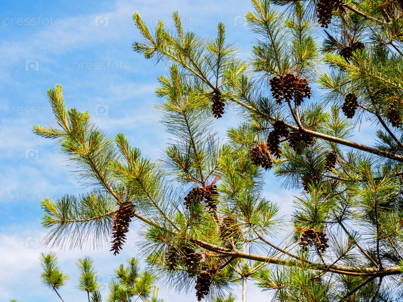 Сосна с шишками на фоне неба, выборочный фокус. Концепция природы для дизайна
