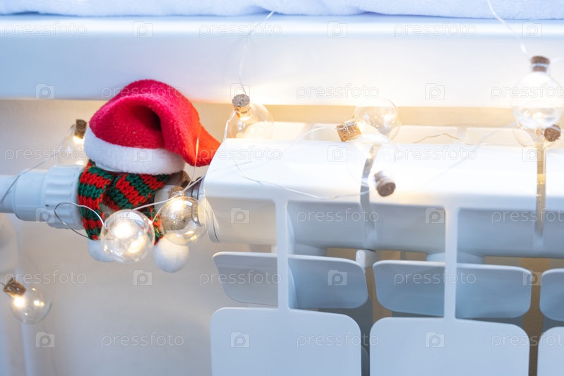 Радиатор в доме завернут в вязаный шарф и шапку. Тепло и уют в доме, утепление, утепление. Праздничный декор на Рождество и Новый год. Экономия тепла, газа в кризис