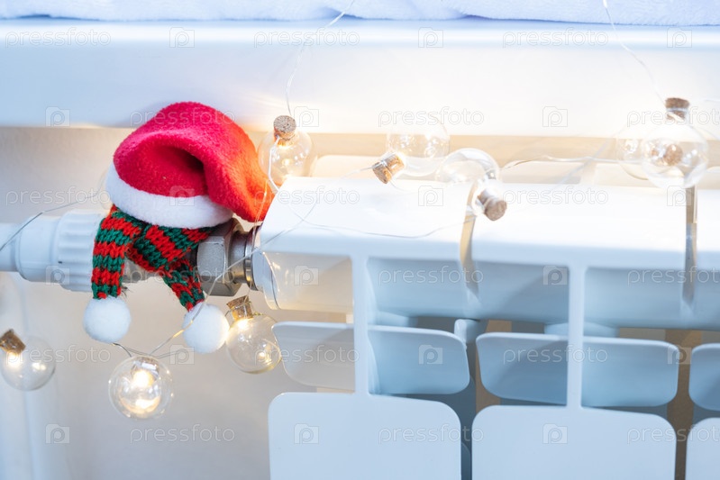Радиатор в доме завернут в вязаный шарф и шапку. Тепло и уют в доме, утепление, утепление. Праздничный декор на Рождество и Новый год. Экономия тепла, газа в кризис