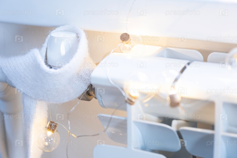 Радиатор в доме завернут в вязаный шарф и шапку. Тепло и уют в доме, утепление, утепление. Праздничный декор на Рождество и Новый год. Экономия тепла, газа в кризис