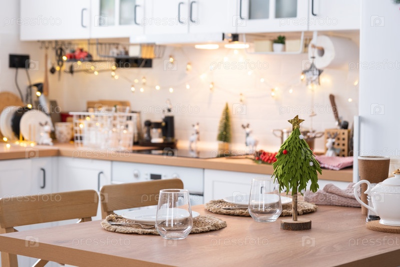 Праздничный рождественский декор и беспорядок на светлой кухне, праздничный завтрак, белый скандинавский интерьер. Новый год, настроение, уютный дом