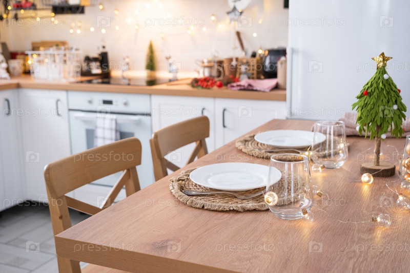 Праздничный рождественский декор и беспорядок на светлой кухне, праздничный завтрак, белый скандинавский интерьер. Новый год, настроение, уютный дом