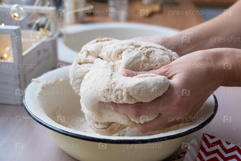Руки месят густое тесто на кухонном столе, украшенном праздничными украшениями на Рождество и Новый год. Выпечка дома, аромат и комфорт. Крупный план