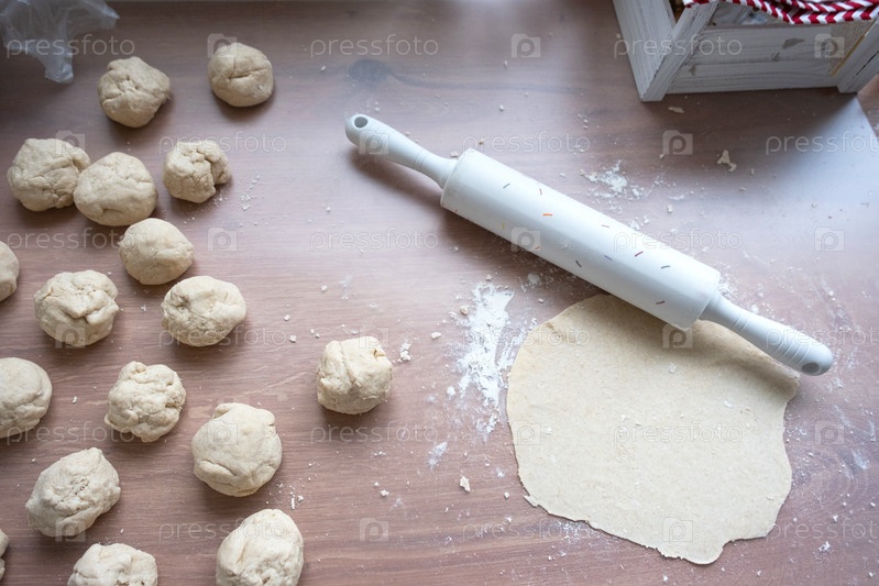 Руки месят густое тесто, раскатывают скалкой на кухонном столе, украшенном праздничными украшениями к Рождеству и Новому году. Выпечка дома, аромат и комфорт