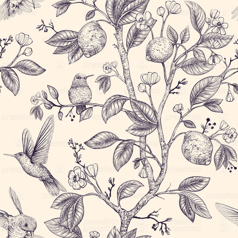 Эскиз рисунка с птицами и цветами. Колибри и цветы, ретро-стиль, природа. Винтажный монохромный цветочный дизайн для оберточной бумаги, обложки, текстиля, ткани, обоев