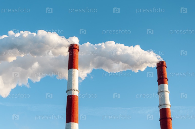 Труба ТЭЦ на фоне голубого неба. Концепция экологии и охраны окружающей среды