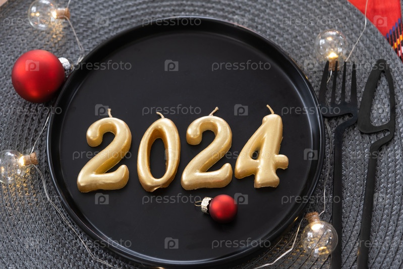 Золотые фигурки 2024 года из свечей на черной тарелке на праздничном столе с новогодней подачей. Интерьер в стиле лофт, вечеринка, застолье. Плетеная салфетка, вилка, нож