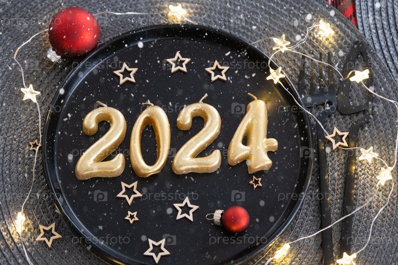 Золотые фигурки 2024 года из свечей на черной тарелке на праздничном столе с новогодней подачей. Интерьер в стиле лофт, вечеринка, застолье. Плетеная салфетка, вилка, нож