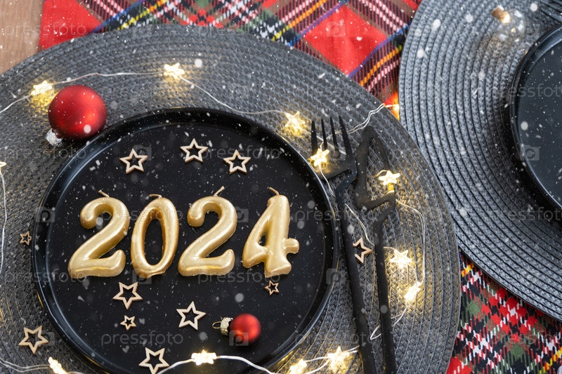 Золотые фигурки 2024 года из свечей на черной тарелке на праздничном столе с новогодней подачей. Интерьер в стиле лофт, вечеринка, застолье. Плетеная салфетка, вилка, нож