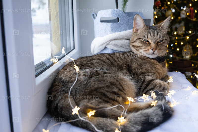 Кот лежит на подоконнике в свете гирлянды. Рождество, Новый год. Кошка крупным планом