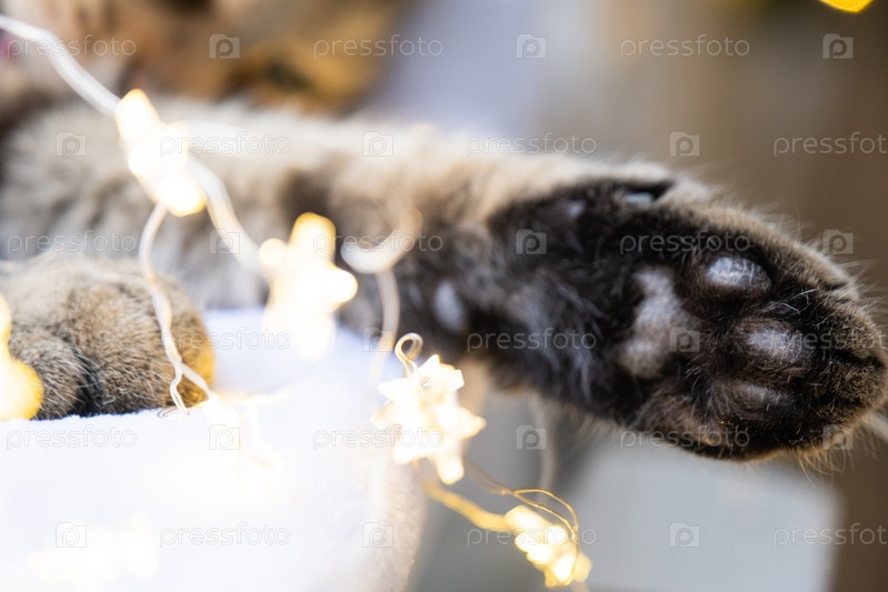 Черные подушечки мягкой кошачьей лапы крупным планом в гирлянде волшебных огней. Рождество, Новый год, праздничное настроение и домашняя уютная атмосфера и комфорт. Год кота и кролика по восточному календарю