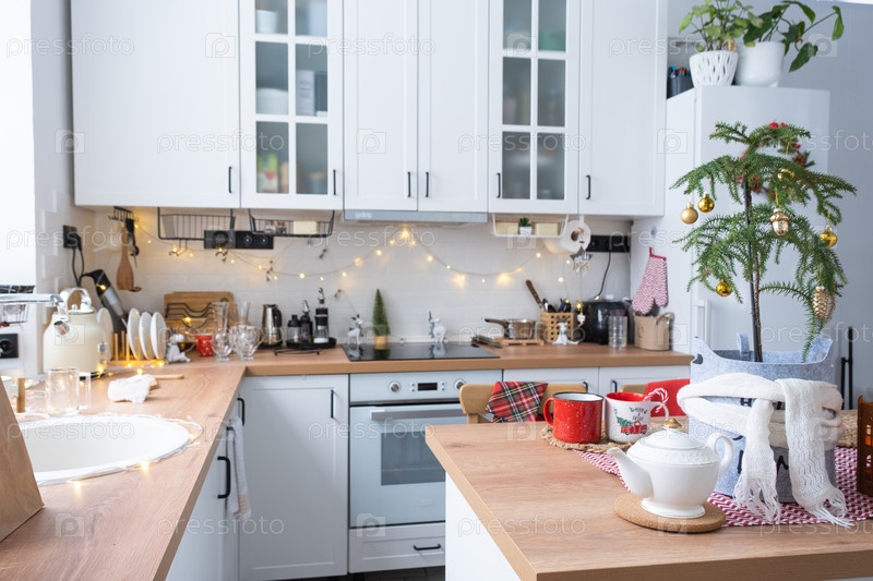 Праздничный рождественский декор в белой кухне, праздничный завтрак, белый скандинавский интерьер. Араукарию как елку украшают и заворачивают в шарф и войлочные кашпо. Новый год, настроение, уютный дом