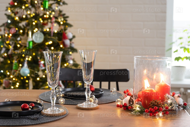 Праздничный стол, накрытый в гостиной на Рождество и Новый год в стиле лофт. Рождественская елка, черные тарелки и вилки, тканые салфетки, модная посуда, уютный интерьер дома