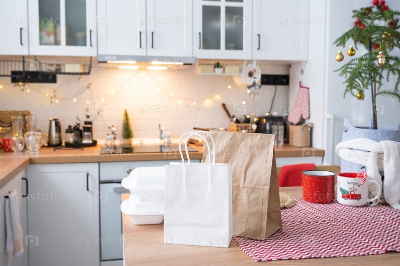 Контейнеры службы доставки еды на столе белая скандинавская праздничная кухня в рождественском декоре. Канун Нового года, экономия времени, лень готовить, горячий заказ, одноразовая пластиковая коробка в сказочном свете. макет
