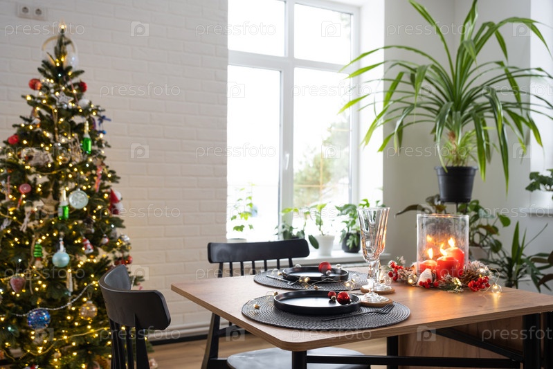 Праздничный стол, накрытый в гостиной на Рождество и Новый год в стиле лофт. Рождественская елка, черные тарелки и вилки, тканые салфетки, модная посуда, уютный интерьер дома