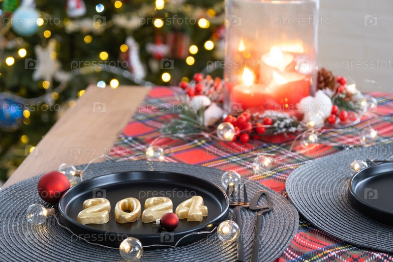 Золотые фигурки 2024 года из свечей на черной тарелке на праздничном столе с новогодней подачей. Интерьер в стиле лофт, вечеринка, застолье. Плетеная салфетка, вилка, нож