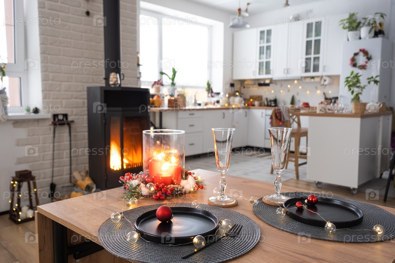 Праздничный интерьер дома украшен к Рождеству и Новому году в стиле лофт с черной печкой, камином, елкой. Теплая комната-студия с накрытым столом, горящим деревом, уютом и отоплением дома