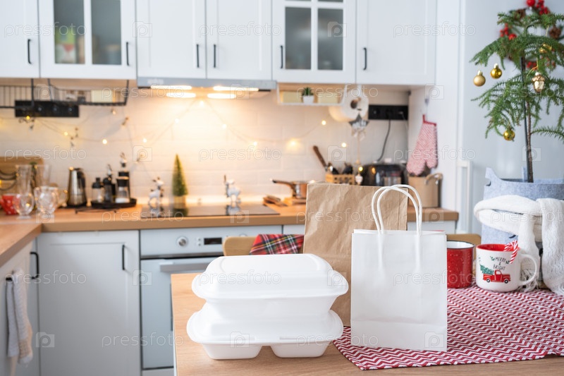 Контейнеры службы доставки еды на столе белая скандинавская праздничная кухня в рождественском декоре. Канун Нового года, экономия времени, лень готовить, горячий заказ, одноразовая пластиковая коробка в сказочном свете. макет
