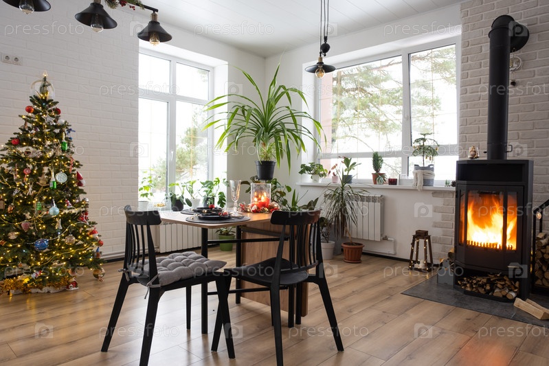 Праздничный интерьер дома украшен к Рождеству и Новому году в стиле лофт с черной печкой, камином, елкой. Теплая комната-студия с накрытым столом, горящим деревом, уютом и отоплением дома
