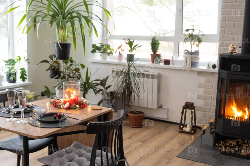 Праздничный интерьер дома украшен к Рождеству и Новому году в стиле лофт с черной печкой, камином, елкой. Теплая комната-студия с накрытым столом, горящим деревом, уютом и отоплением дома