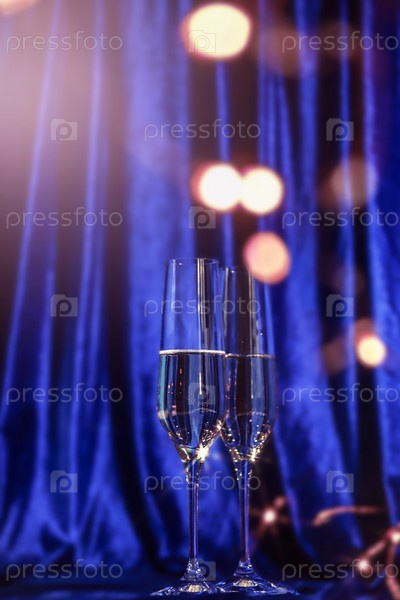 Бокалы шампанского и золотая гирлянда на синем бархатном фоне. Концепция рождественских и новогодних мероприятий