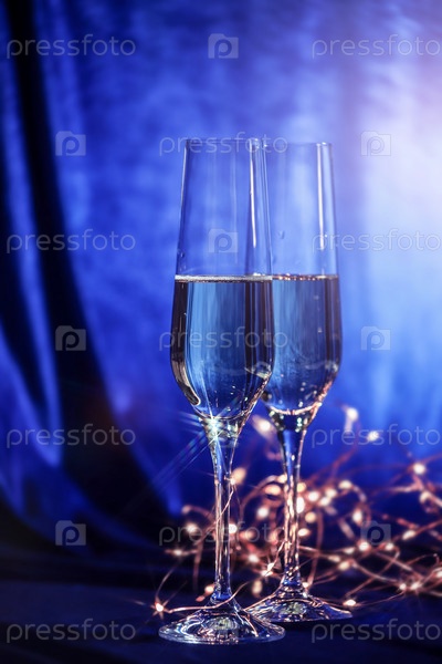 Бокалы шампанского и золотая гирлянда на синем бархатном фоне. Концепция рождественских и новогодних мероприятий. Праздничная открытка