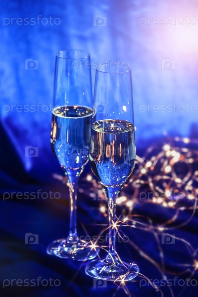 Бокалы шампанского и золотая гирлянда на синем бархатном фоне. Концепция рождественских и новогодних мероприятий. Праздничная открытка