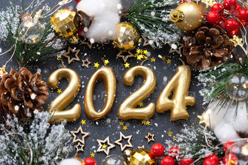 Золотые фигуры 2024 года из свечей на фоне черного каменного сланца украшены праздничным декором из звезд, пайеток, еловых веток, шаров и гирлянд. Открытка, с Новым годом