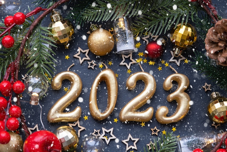 Золотые фигуры 2023 года из свечей на фоне черного каменного сланца украшены праздничным декором из звезд, пайеток, еловых веток, шаров и гирлянд. Открытка, с Новым годом