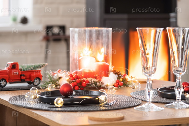 Праздничный интерьер дома украшен к Рождеству и Новому году в стиле лофт с черной печкой, камином, елкой. Теплая комната-студия с накрытым столом, горящим деревом, уютом и отоплением дома