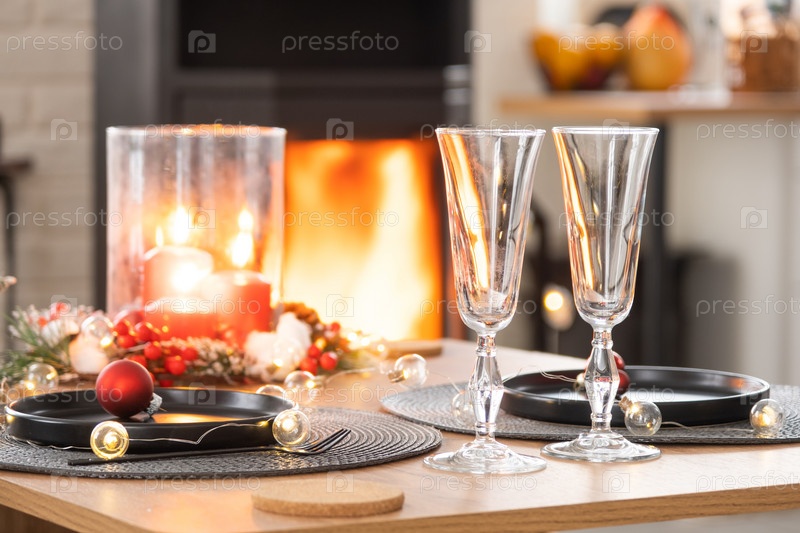 Праздничный интерьер дома украшен к Рождеству и Новому году в стиле лофт с черной печкой, камином, елкой. Теплая комната-студия с накрытым столом, горящим деревом, уютом и отоплением дома