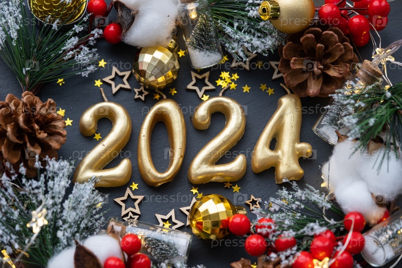 Золотые фигуры 2024 года из свечей на фоне черного каменного сланца украшены праздничным декором из звезд, пайеток, еловых веток, шаров и гирлянд. Открытка, с Новым годом