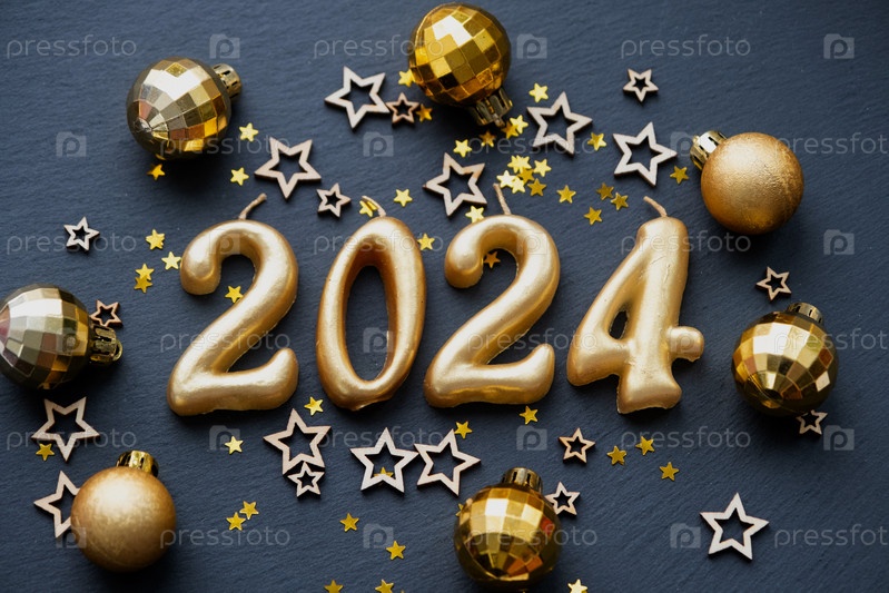 Золотые фигуры 2024 года из свечей на фоне черного каменного сланца украшены праздничным декором из звезд, пайеток, еловых веток, шаров и гирлянд. Открытка, с Новым годом