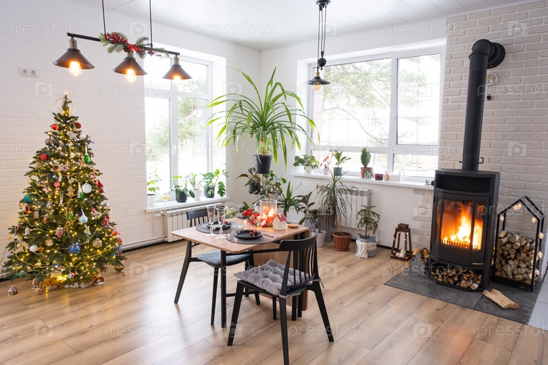 Праздничный интерьер дома украшен к Рождеству и Новому году в стиле лофт с черной печкой, камином, елкой. Теплая комната-студия с накрытым столом, горящим деревом, уютом и отоплением дома