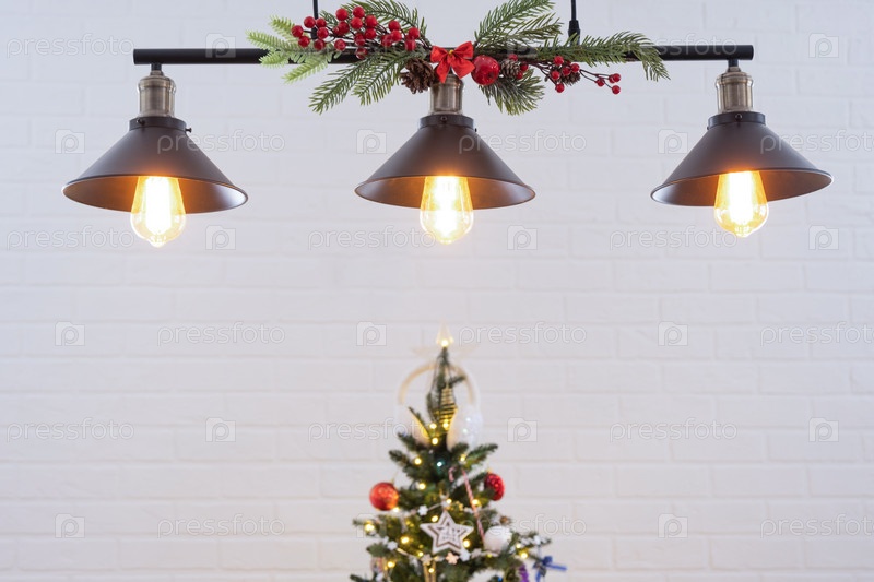 Черный абажур в индустриальном стиле лофт украшен еловыми ветками к Рождеству и Новому году на фоне белой кирпичной стены. Крупный план, минимализм