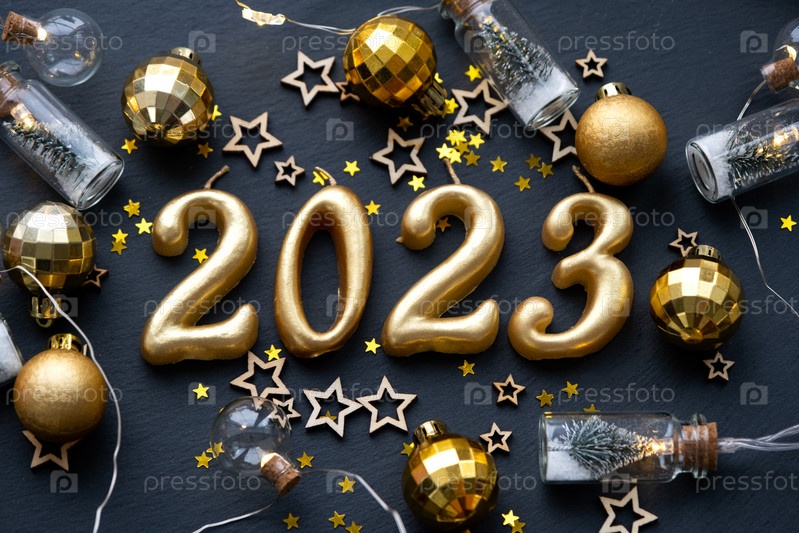 Золотые фигуры 2023 года из свечей на фоне черного каменного сланца украшены праздничным декором из звезд, пайеток, еловых веток, шаров и гирлянд. Открытка, с Новым годом
