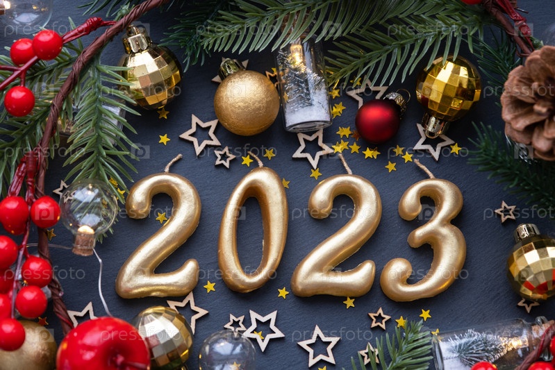 Золотые фигуры 2023 года из свечей на фоне черного каменного сланца украшены праздничным декором из звезд, пайеток, еловых веток, шаров и гирлянд. Открытка, с Новым годом
