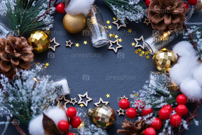Праздничная рама с местом для текста на тему Рождества и Нового года. Блески, звезды, гирлянды, шишки, шары на фоне черного камня из сланца. Copyspace, поздравительная открытка